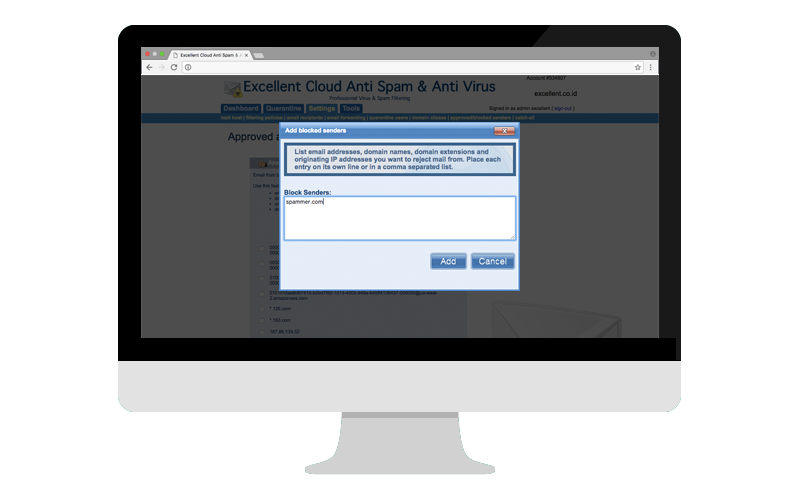 Excellent MX Backup/Anti Spam & Anti Virus Gateway adalah layanan untuk incoming email server yang berfungsi sebagai Anti Spam & Anti Virus, serta MX Backup email klien. Layanan ini hanya menangani email masuk (incoming) dan melakukan scanning email agar terbebas dari spam dan virus kemudian diteruskan kepada user.
